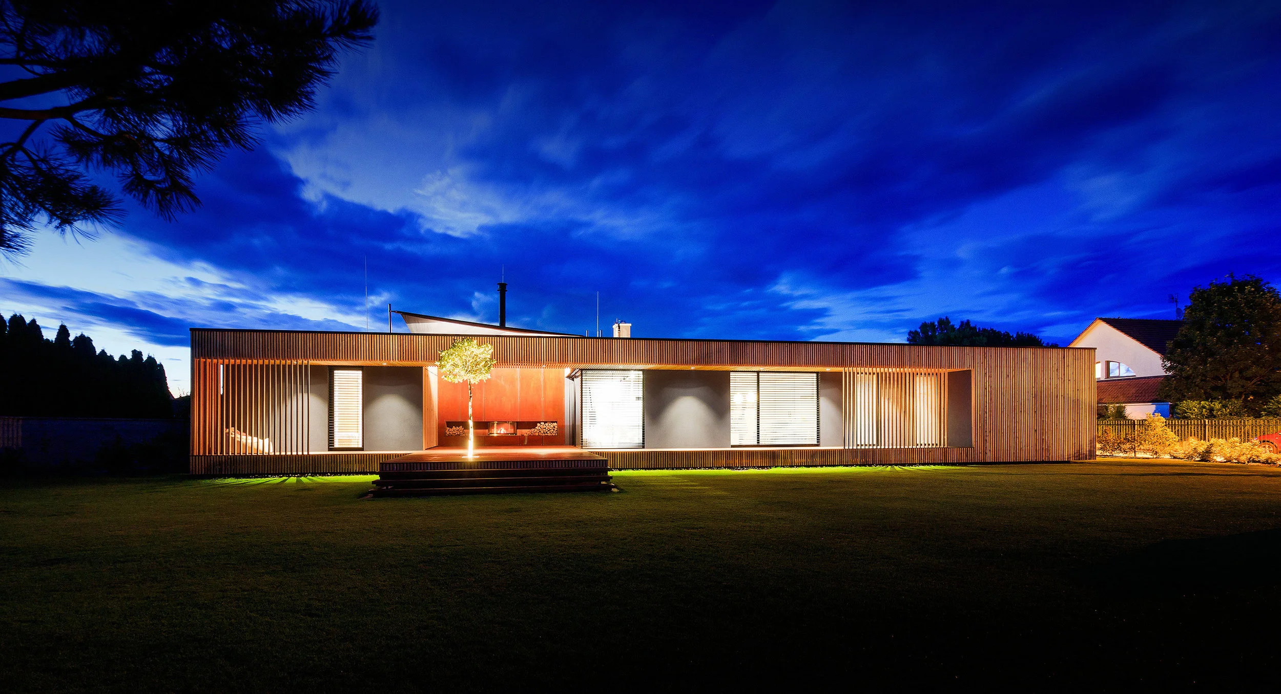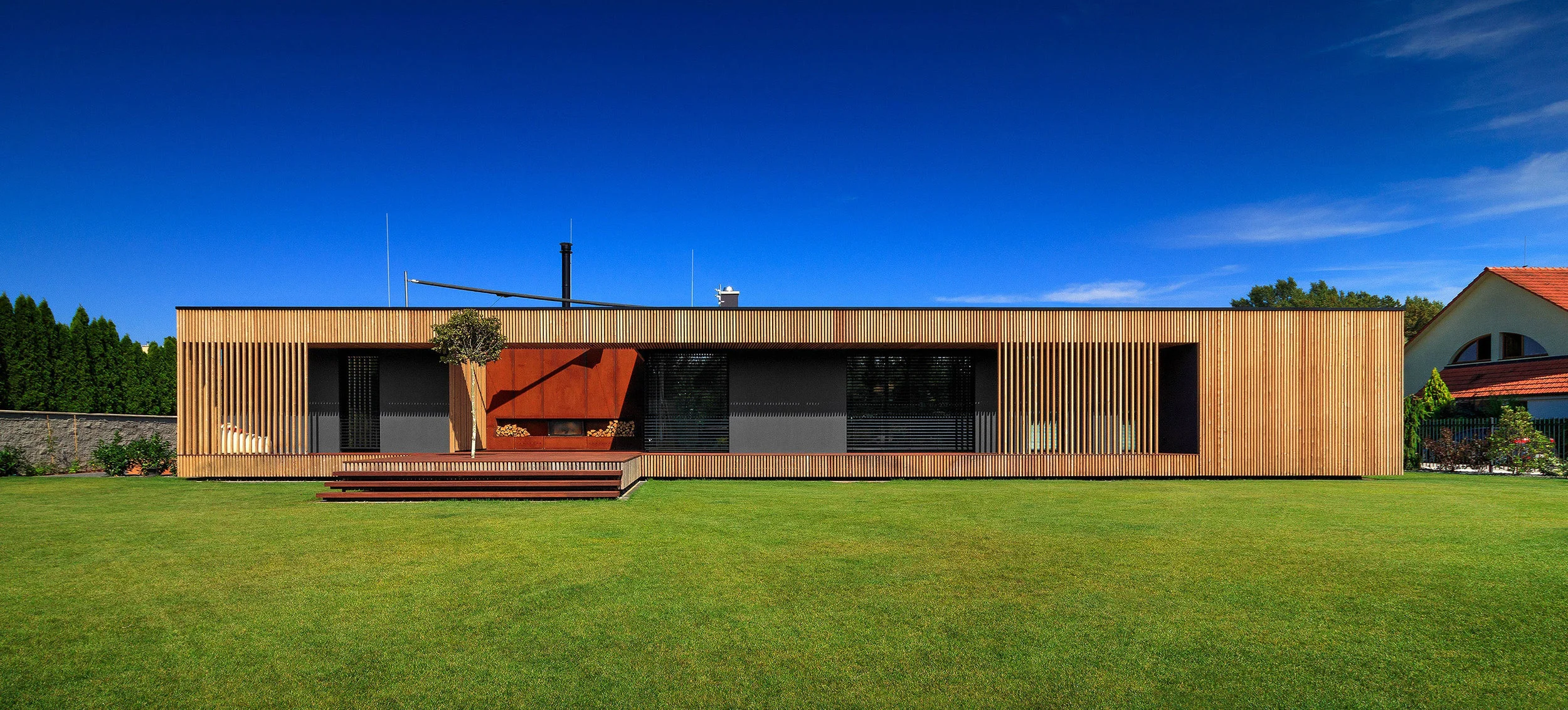 The project is based on an invited architectural competition. A quiet residential area lying close to the Váh River is a popular relaxation zone. The spacious flatland estate is located at the corner of a calm street in a built-up area of detached houses. The size of the plot makes it possible to divide the functions into two one-storey prisms: while the house communicates with the garden and with its surroundings, the nearby standing objects of the garage and the gym create a barrier from the northern neighbour.
