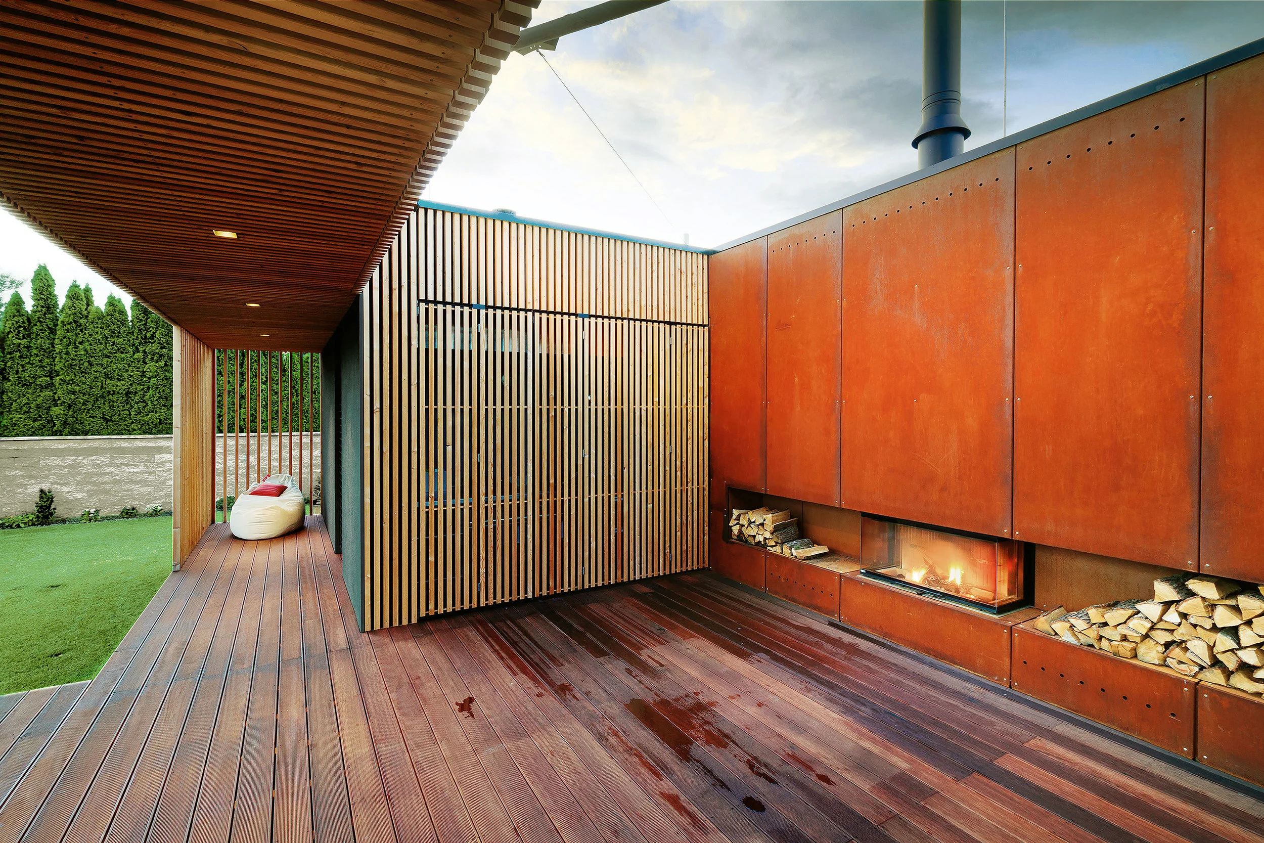 C2 House represents a family living in a quiet green neighbourhood for people who like spending their free time outdoors all year long. The main idea is the diffusion of spaces within the house and the garden. The atrium with a fireplace and a summer kitchen becomes the core of the family life.