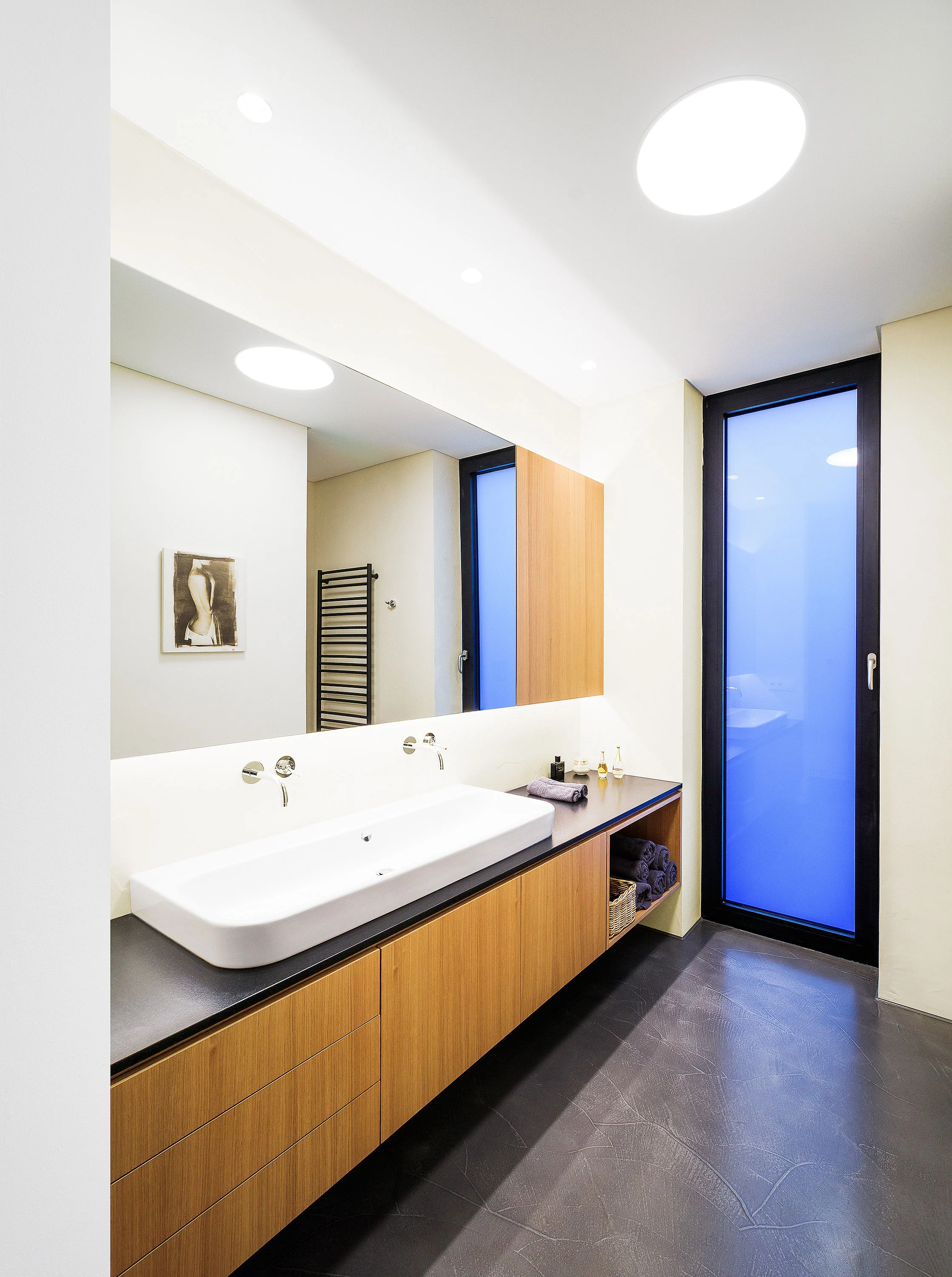 The inner layout of the house logically follows the conditions of its environment and the way of life of its inhabitants. The main living space and the private zone of the parents are both directly connected with the loggia and the garden. The afternoon sun enters the living room through the atrium. With an outdoor fireplace, a summer kitchen and a sun shade, the atrium becomes an exterior living room which can be used all year long. Children’s rooms are intentionally located close to the entrance, creating an autonomous space.