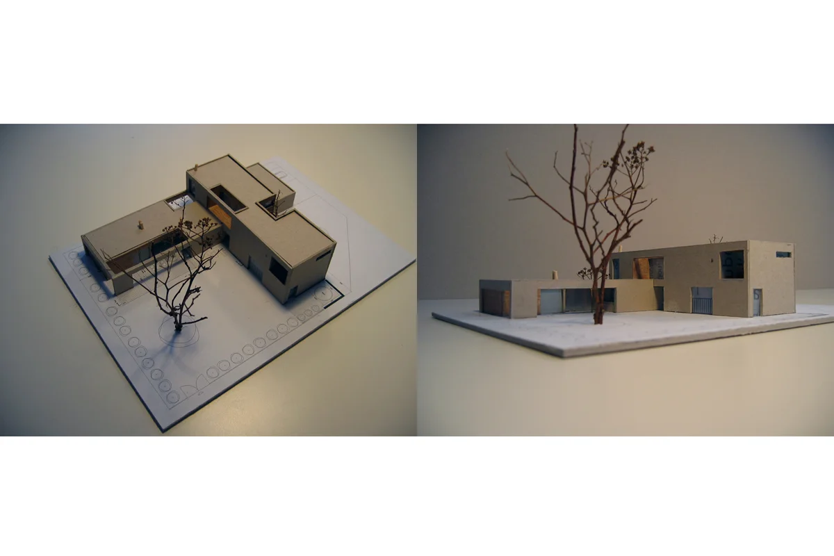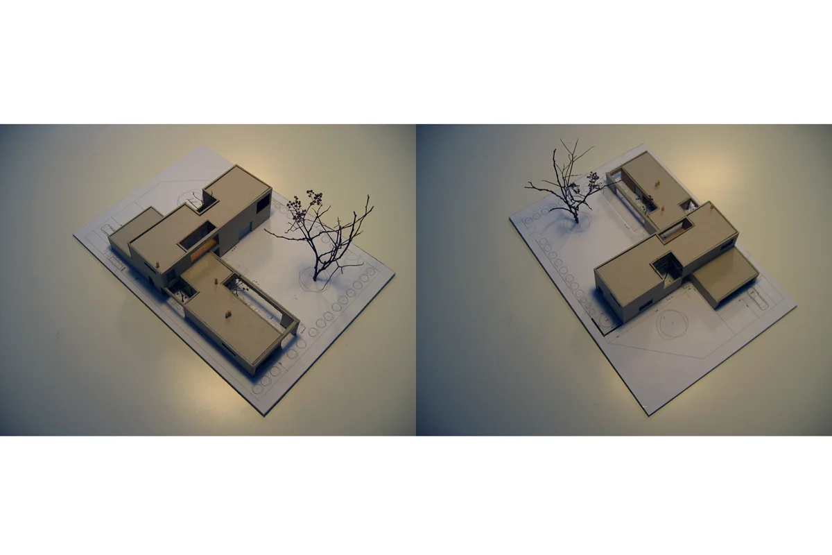 First we have created a simple T-shaped volume with an ideal functional layout matching the rhythm of the family life, the movement of the sun, the view…Than we have started to remove volumes and to create the patios. In this sense, a threedimensional work with the inner space of the house was very important – patios provide interesting vistas, allow the sun and the daylight to enter the spaces in a spectacular way and offer surprising moments when moving through the house. The courtyards as well offer different ways of spending time in the exterior – summer kitchen, dining area under the tree, kitchen patio, lounge area around the fire-place…